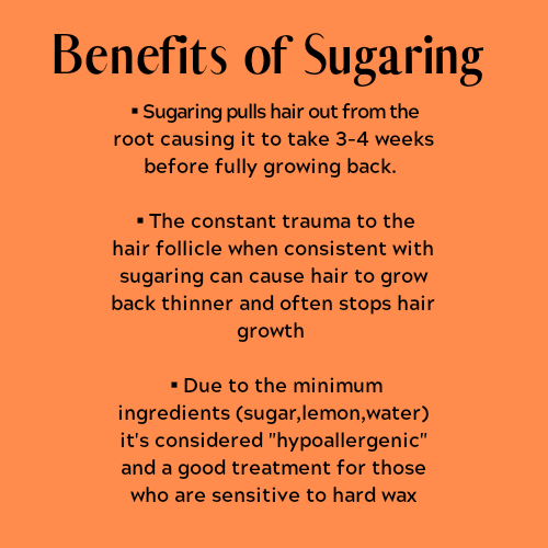 Sugaring is the practice of removing hair from the root using a sugar-based wax at room temperature. With sugaring your hair may grow back softer and thinner than before especially the more you do it.